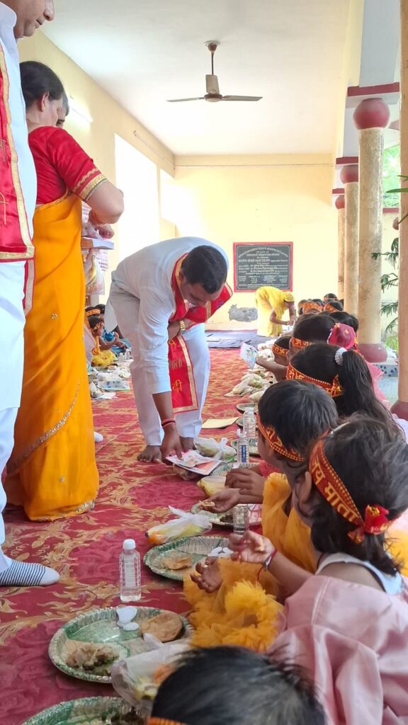 रोहनिया। काशी विद्यापीठ ब्लॉक मुख्यालय पर ब्लॉक प्रमुख प्रतिनिधि प्रवेश पटेल की देखरेख में पोषण महा अभियान के तहत आयोजित कन्या पूजन समारोह कार्यक्रम में मंगलवार को शरदीय नवरात्र के अष्टमी पर मुख्य अतिथि रोहनिया विधायक डॉक्टर सुनील पटेल तथा विशिष्ट अतिथि विधान परिषद सदस्य एवं भाजपा जिलाध्यक्ष हंसराज विश्वकर्मा ने कन्या पूजन समारोह कार्यक्रम का दीप प्रज्वलंकर कर शुभारंभ करते हुए का 51 कन्याओं को तिलक लगाकर पूजन कर उनसे आशीर्वाद प्राप्त किया।इस दौरान मुख्य रूप से अजीत पटेल राष्ट्रीय सचिव एवं प्रतिनिधि विधान परिषद सदस्य ,हंसराज विश्वकर्मा जिला अध्यक्ष भाजपा तथा विधान परिषद सदस्य , प्रवेश पटेल ब्लॉक प्रमुख प्रतिनिधि काशी विद्यापीठ , अखिलेश देवराज पटेल युवा नेता अपना दल एस ,सर्वेश पटेल राष्ट्रीय अध्यक्ष आईपीसी, आनंद पटेल ,भाजपा नेता, बहादुर पटेल ,ग्राम प्रधान लखीमपुर ,राजकुमार कश्यप जिला महासचिव एवं कार्यालय प्रभारी, श्याम बली पटेल जिला महासचिव , विनोद पटेल जिला उपाध्यक्ष , शुभम, सहित जिला ,विधानसभा , सेक्टर ,जोन तथा बूथ स्तर के सम्मानित कार्यकर्ता एवं पदाधिकारी गण उपस्थित रहे ।