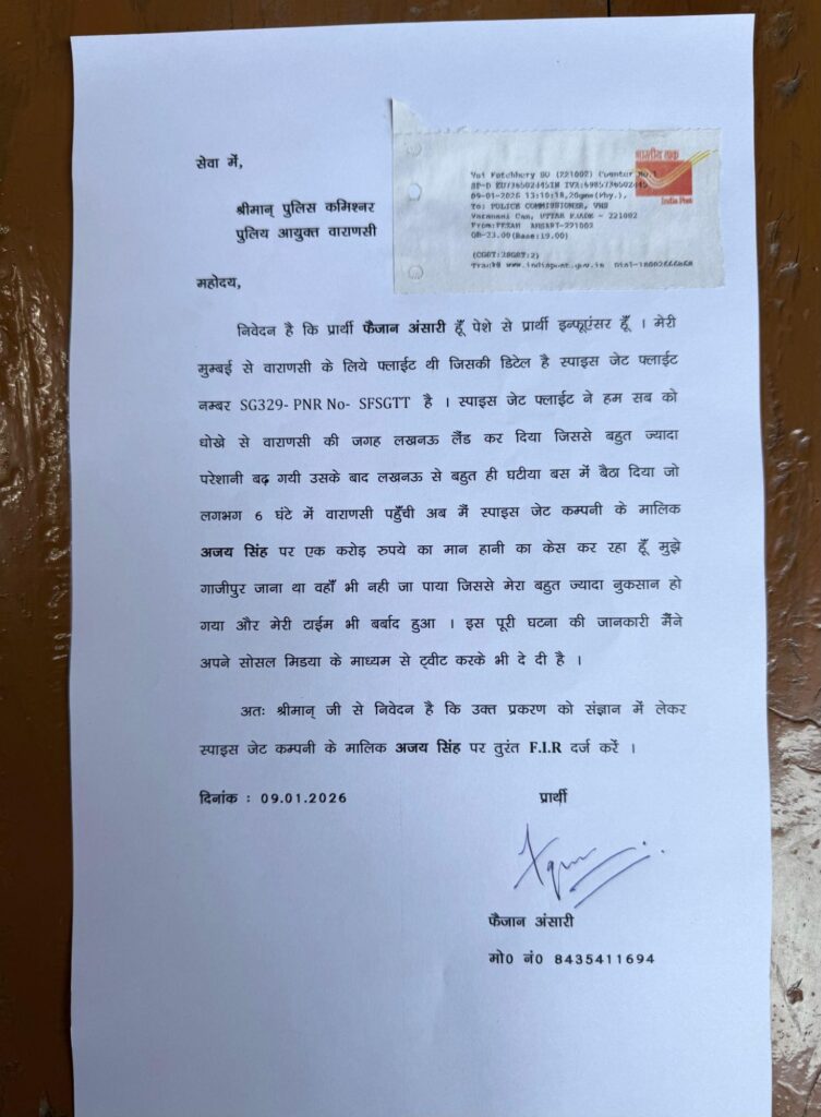 यात्री फैजान अंसारी ने वाराणसी के पुलिस कमिश्नर को प्रार्थना पत्र देकर स्पाइस जेट के खिलाफ कार्रवाई की मांग की है।फ़ैज़ान का आरोप है कि संबंधित फ्लाइट को बिना पूर्व सूचना के लखनऊ में उतार दिया गया, जबकि फ्लाइट को वाराणसी पहुंचना था। यात्री फैजान अंसारी के अनुसार, यह फ्लाइट बीती रात वाराणसी आने वाली थी, लेकिन अचानक निर्णय लेकर यात्रियों को लखनऊ में ही उतार दिया गया। इसके बाद यात्रियों को वाराणसी पहुंचाने के लिए खटारा और असुविधाजनक बसों की व्यवस्था की गई, जिससे यात्रियों को भारी परेशानी का सामना करना पड़ा।फैजान अंसारी ने पुलिस कमिश्नर को दिए गए प्रार्थना पत्र में बताया कि स्पाइस जेट की इस फ्लाइट में 150 से अधिक यात्री सवार थे। सभी यात्रियों को रात के समय बसों से वाराणसी भेजा गया, जिससे न सिर्फ शारीरिक बल्कि मानसिक उत्पीड़न भी हुआ। यात्रियों को न तो कोई स्पष्ट जानकारी दी गई और न ही कोई वैकल्पिक उड़ान या उचित सुविधा उपलब्ध कराई गई।यात्री का कहना है कि एयरलाइंस की इस लापरवाही से उनकी सामाजिक प्रतिष्ठा को ठेस पहुंची है और उन्हें आर्थिक व मानसिक नुकसान हुआ है। इसी आधार पर उन्होंने स्पाइस जेट के खिलाफ एक करोड़ रुपये का मानहानि दावा ठोकने की बात कही है। उन्होंने यह भी आरोप लगाया कि स्पाइस जेट ने यात्रियों के साथ अमानवीय व्यवहार किया और उनकी सुरक्षा व सुविधा की पूरी तरह अनदेखी की।फैजान अंसारी ने अपने शिकायती पत्र में स्पाइस जेट कंपनी के मालिक अजय सिंह के खिलाफ भी मामला दर्ज करने की मांग की है। उनका कहना है कि कंपनी की उच्च प्रबंधन स्तर पर जवाबदेही तय होनी चाहिए, ताकि भविष्य में इस तरह की घटनाओं की पुनरावृत्ति न हो।इस घटना के बाद अन्य यात्रियों में भी स्पाइस जेट के प्रति भारी नाराजगी देखने को मिली। यात्रियों का कहना है कि एक प्रतिष्ठित एयरलाइंस से इस तरह की अव्यवस्था और गैर-जिम्मेदाराना रवैया अपेक्षित नहीं था। कई यात्रियों ने आरोप लगाया कि बसों की स्थिति बेहद खराब थी और लंबी दूरी की यात्रा रात में करना उनके लिए जोखिम भरा साबित हुआ।यात्रियों ने यह भी सवाल उठाया कि यदि तकनीकी या परिचालन कारणों से फ्लाइट को लखनऊ में उतारना जरूरी था, तो इसकी पूर्व सूचना क्यों नहीं दी गई और क्यों यात्रियों के लिए बेहतर वैकल्पिक व्यवस्था नहीं की गई। यात्रियों का कहना है कि एयरलाइंस की ओर से न तो कोई माफी मांगी गई और न ही किसी तरह का संतोषजनक जवाब दिया गया। इस मामले ने एक बार फिर निजी एयरलाइंस की यात्री सेवा व्यवस्था पर सवाल खड़े कर दिए हैं। उपभोक्ता अधिकारों से जुड़े लोगों का कहना है कि यात्रियों को समय पर सही जानकारी देना और सुरक्षित व सम्मानजनक यात्रा सुनिश्चित करना एयरलाइंस की जिम्मेदारी है। 
