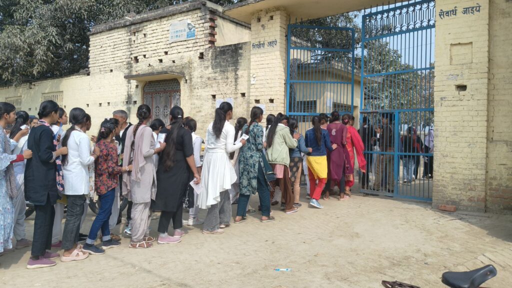 परीक्षा केंद्र परिसर में प्रवेश करने के समय प्रवेश द्वार पर सख्ती के के साथ चेकिंग किया जा रहा है।